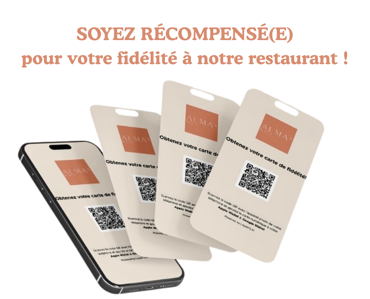 Nous savons que vous avez l'embarras du choix lorsque vous sélectionnez un restaurant. Nous voulons vous remercier de nous avoir choisis et vous récompenser pour votre fidélité. En tant que membre du programme de fidélisation des Amis d'Alma, vous recevrez un point pour chaque franc dépensé á Alma's.